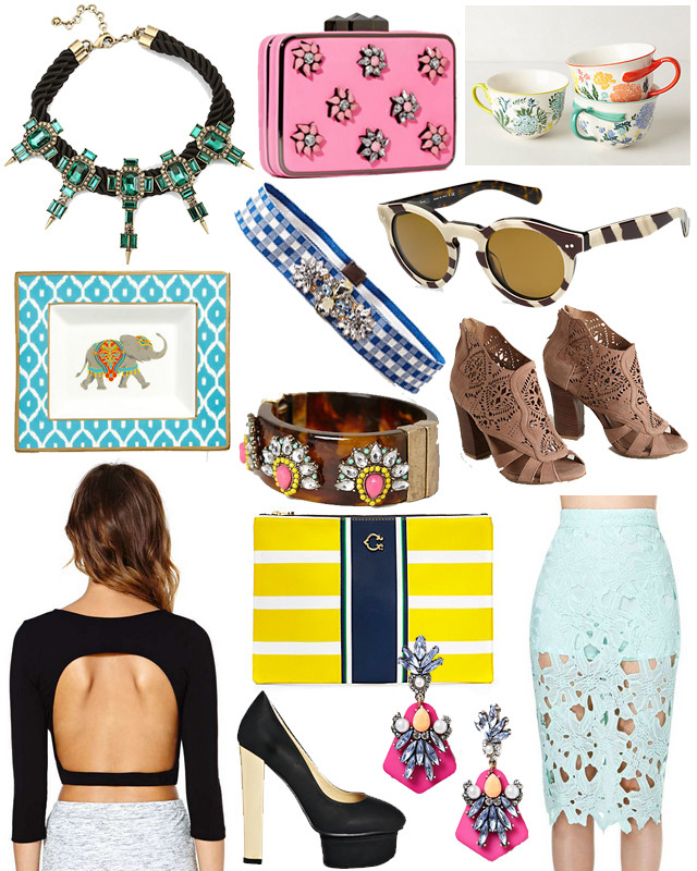 NECKLACE: C. Wonder // CLUTCH: Nasty Gal // MUG: Anthropologie // PLATE: C. Wonder // BELT: Anthropologie // CUFF: Anthropologie // SUNNIES: Ralph Lauren // SANDALS: Asos // CROP TOP: Nasty Gal // EARRINGS: Anthropologie // SKIRT: Nasty Gal