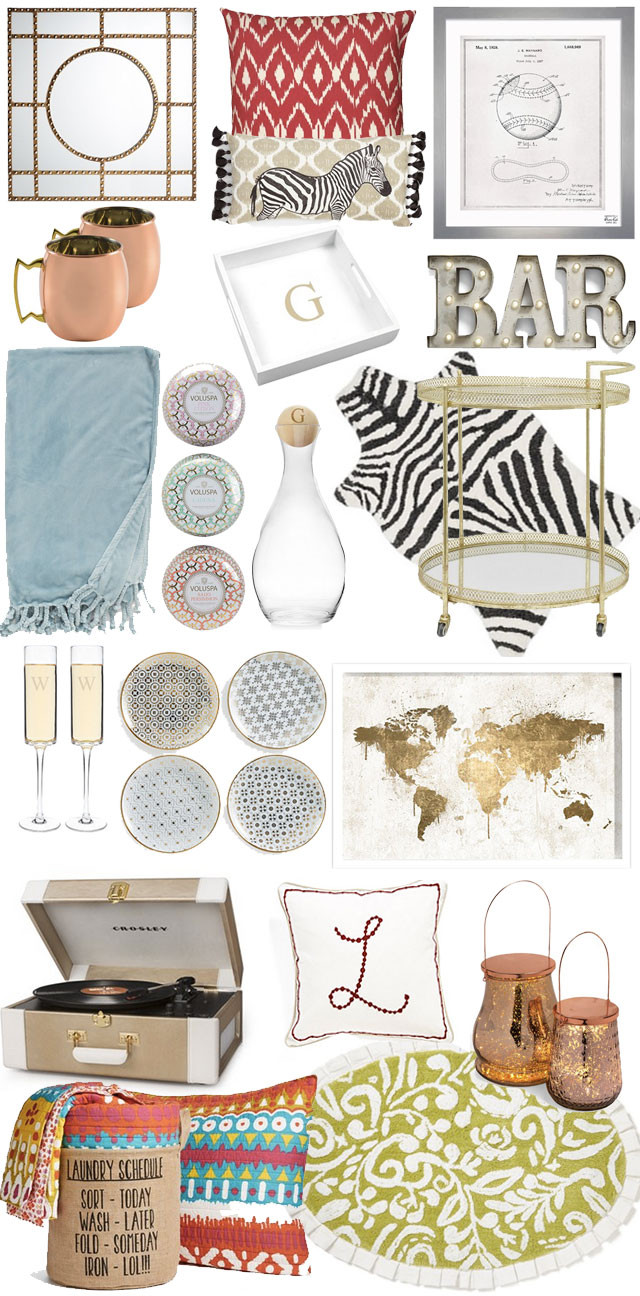 Mirror // Ikat Pillow // Zebra Pillow // Baseball Art // Copper Mugs // Monogram Tray // Bar Sign // Throw Blanket // Voluspa Candle Set // Monogram Decanter // Zebra Rug // Bar Cart // Monogram Champagne Glasses // Plate Set // Map Art // Record Player // Monogram Pillow // Lanterns // Bedding Set // Bath Rug